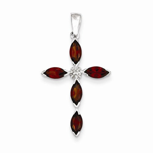 Sterling Silver Rhodium Garnet & Diamond Cross pendant