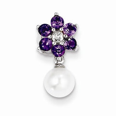 Metal: Sterling SilverLength:16 mmWidth:8 mmGemstones: Pearl, Amethyst, DiamondDiamond Weight: 0.004 CTGem Weight: 1.65 CTFinish: Polished, Rhodium-platedFree U.S. Shipping for orders over $99 Protected by our 30-Day Risk Free Returns!