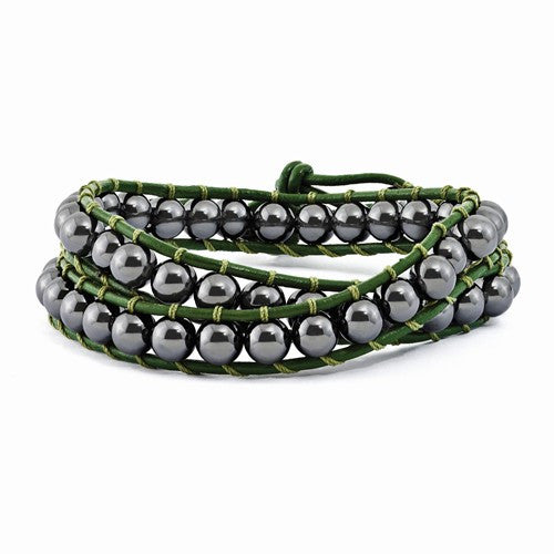 6 Hematite Beads Green Leather Cord Multi Wrap Bracelet