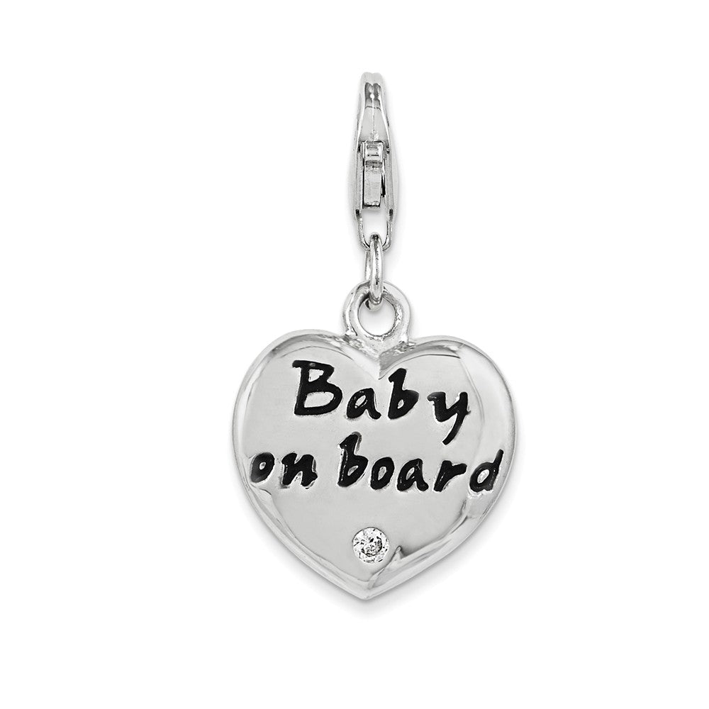 Polished Enameled CZ Baby On Board Heart Charm in Sterling Silver