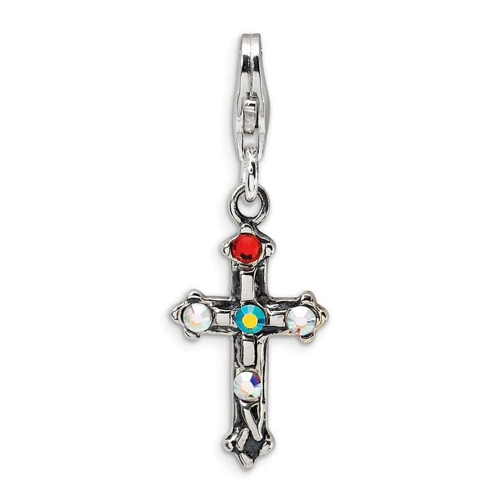 Swarovski Element Antiqued Cross w/Lob. Clasp Charm in Sterling Silver