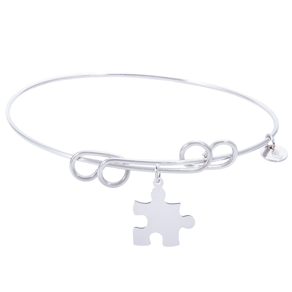 Create your own expression with our Carefree Bangle Bracelet made from Sterling Silver. Each bracelet is rhodium plated to prevent tarnishing and give it a lasting brilliant finish. Show your support with the Autism Awareness Puzzle Piece Charm. A portion of the proceeds from this charitable charm will benefit research and education