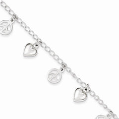 Sterling Silver Polished Peace Sign and Heart Bracelet