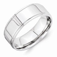 Vitalium Polished 8mm Ridged Edge Flat Wedding Band Ring