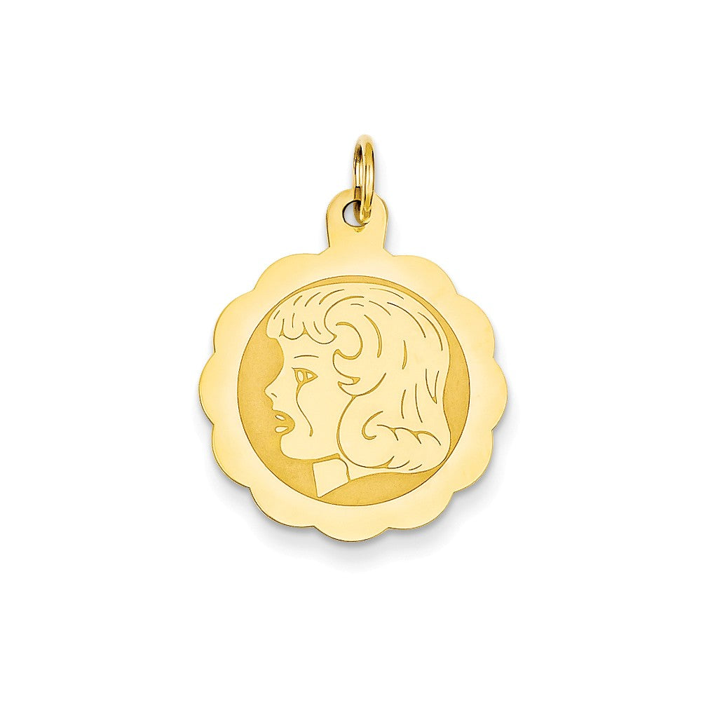 Girl Head on .013 Gauge Engravable Scalloped Disc Charm in 14k Gold