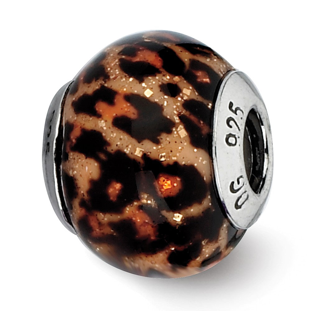 Brown Jaguar Glitter Overlay Glass Charm Bead in Sterling Silver